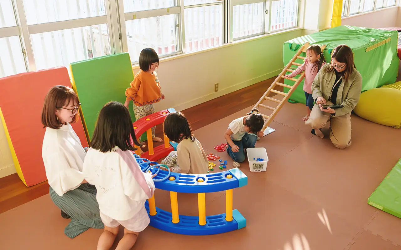 療育では、OTとSTとPTと保育士がそれぞれの専門性を活かしながら、遊びや活動の中で子どもの力と課題を多角的に捉え、身体の土台づくりから始めて、日々の関わりに反映していきます。